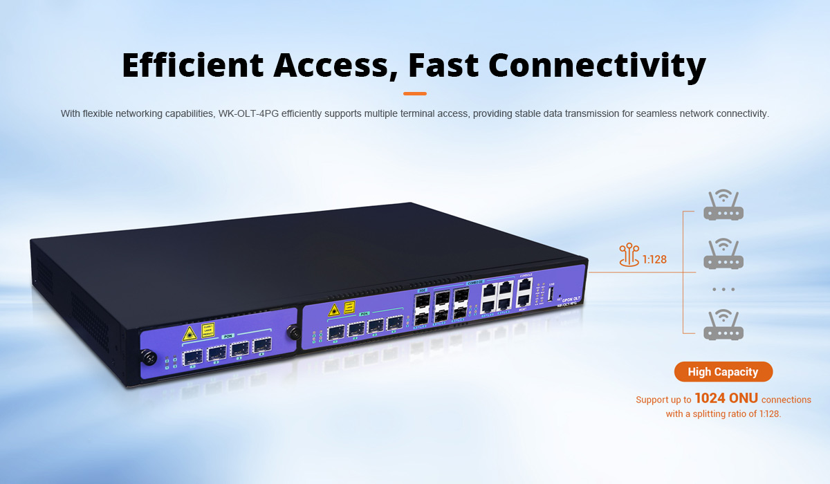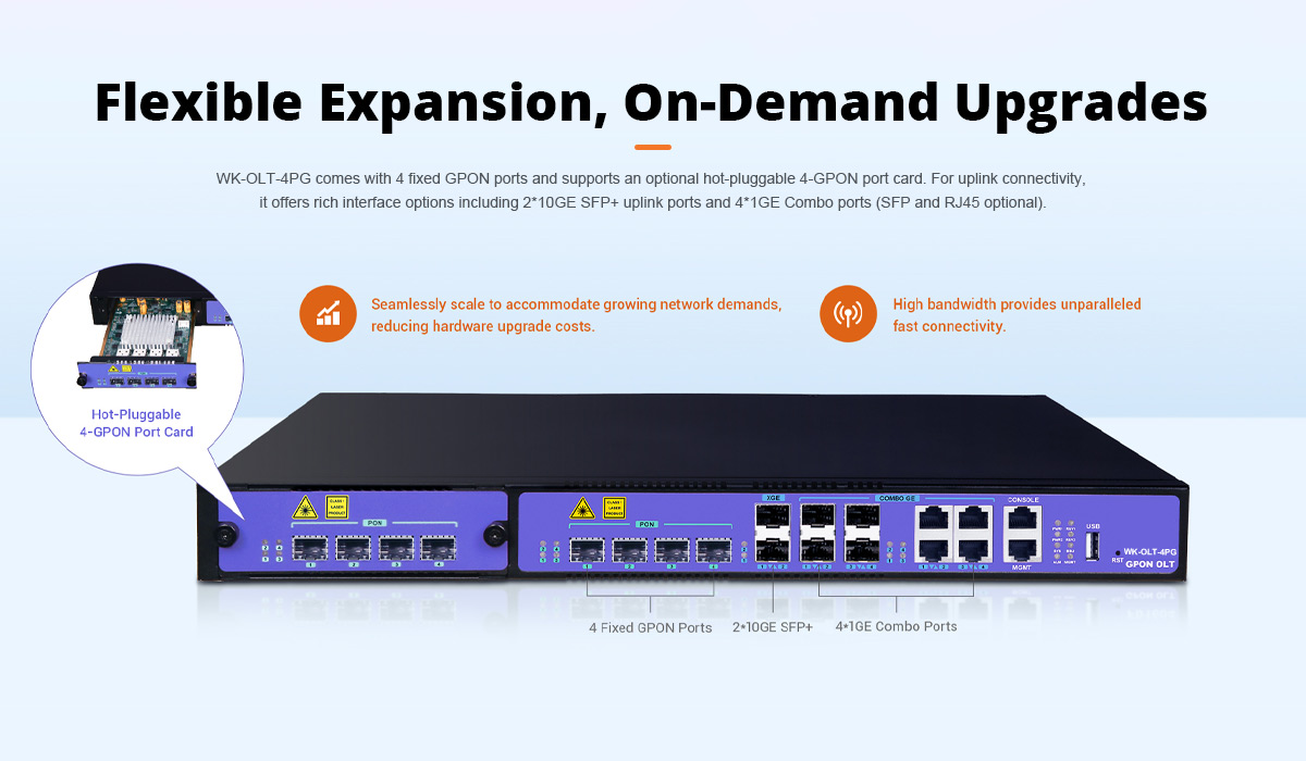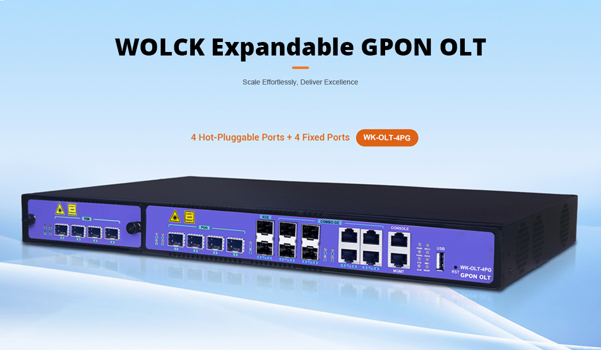 In today's era of rapid digital economy development, applications such as high-definition video, the Internet of Things (IoT), and cloud computing are booming. User demands for network bandwidth, stability, and scalability are growing exponentially. Traditional OLT devices, plagued by fixed ports, high upgrade costs, and complex maintenance, can barely adapt to the flexible and ever-changing network deployment needs. Against this backdrop, plug-and-play OLT emerged as the times require. With its modular design and flexible expansion capabilities, it has become a core device for communication network upgrades. Wolck's 4/8 Ports Expandable GPON OLT (model WK-OLT-4/8PG), is a representative product under this technological trend, providing efficient solutions for various network scenarios.
