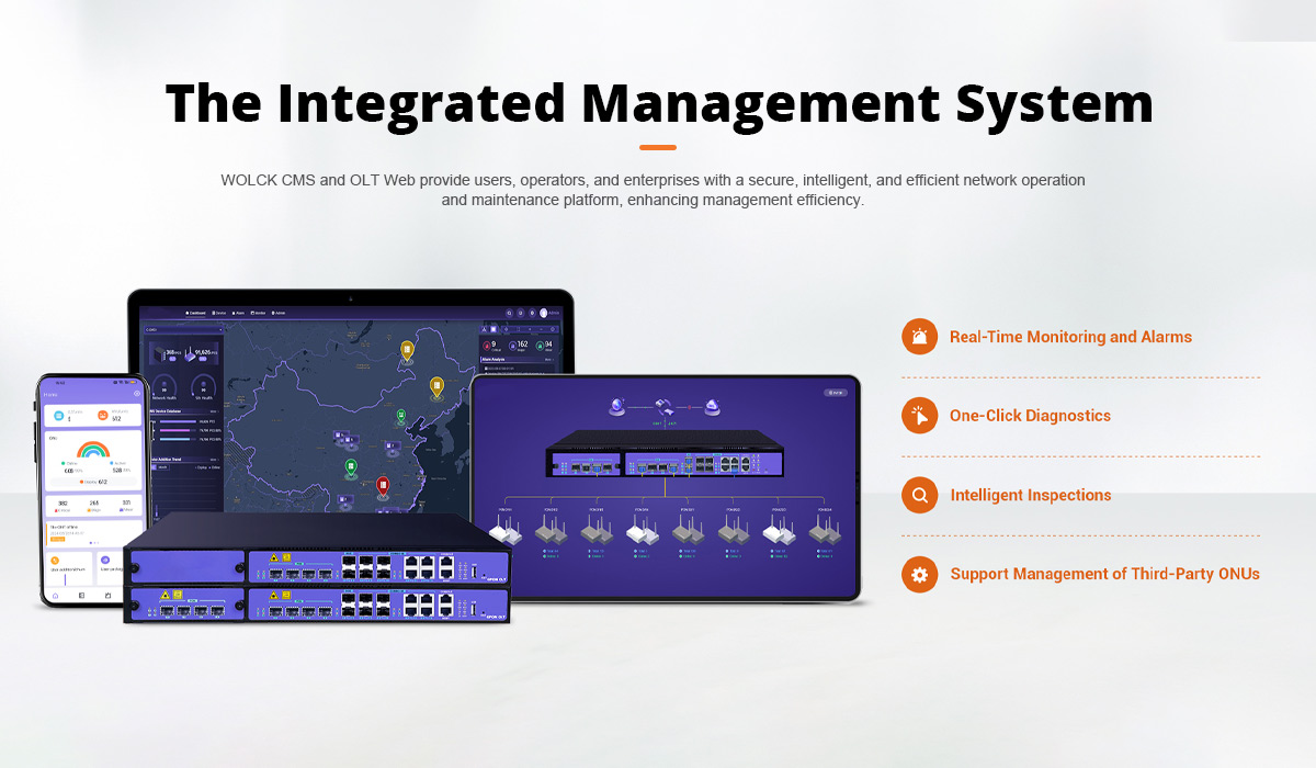 Management convenience is greatly improved. The device is equipped with an intuitive Web management interface, allowing users to clearly view the ONU connection status of each PON port and easily implement device configuration, status monitoring, and fault troubleshooting. It also supports multiple management methods such as CLI, SNMP, TELNET, and SSH, compatible with different operation and maintenance habits. Wolck's CMS integrated management system provides real-time alarms, one-click diagnosis, and intelligent inspection functions, and also supports third-party ONU management, significantly improving network operation and maintenance efficiency and reducing management costs.